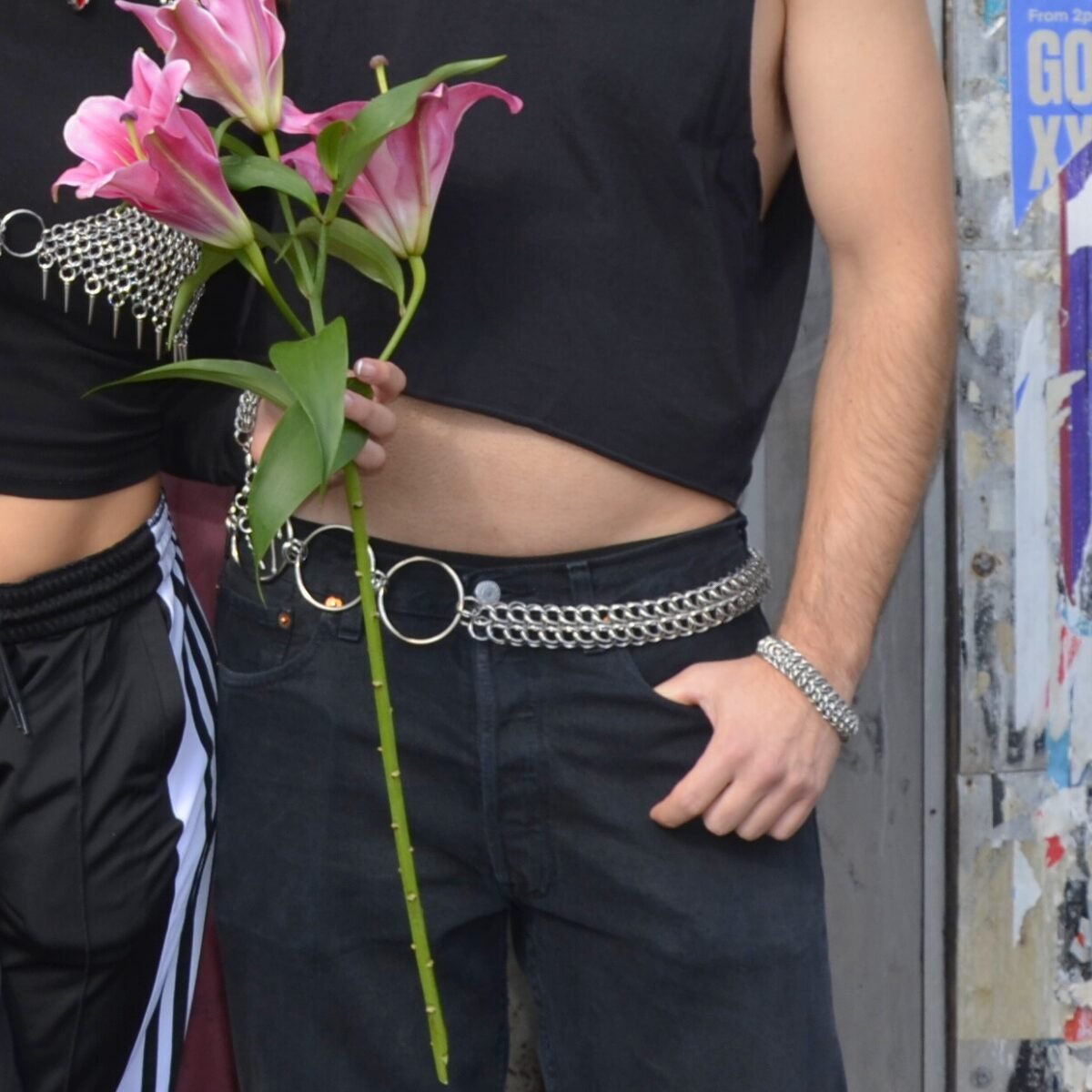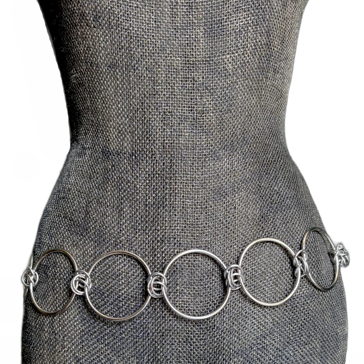 The Chelsea chainmaille belt is an accessory that refuses to blend in. Made from Barrel pieces sandwiched between large O rings, this piece exudes attitude. Each oversized ring is meticulously linked with its smaller connecting loops, creating a continuous chain that wraps effortlessly around your body. The shapes serve as a bold focal point, making this belt the center of attention anywhere it goes.