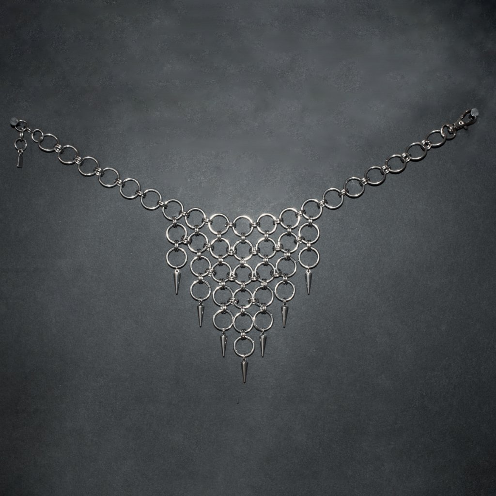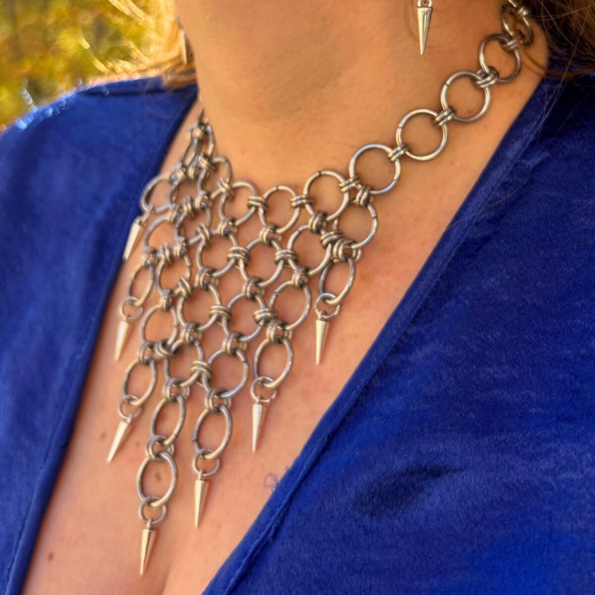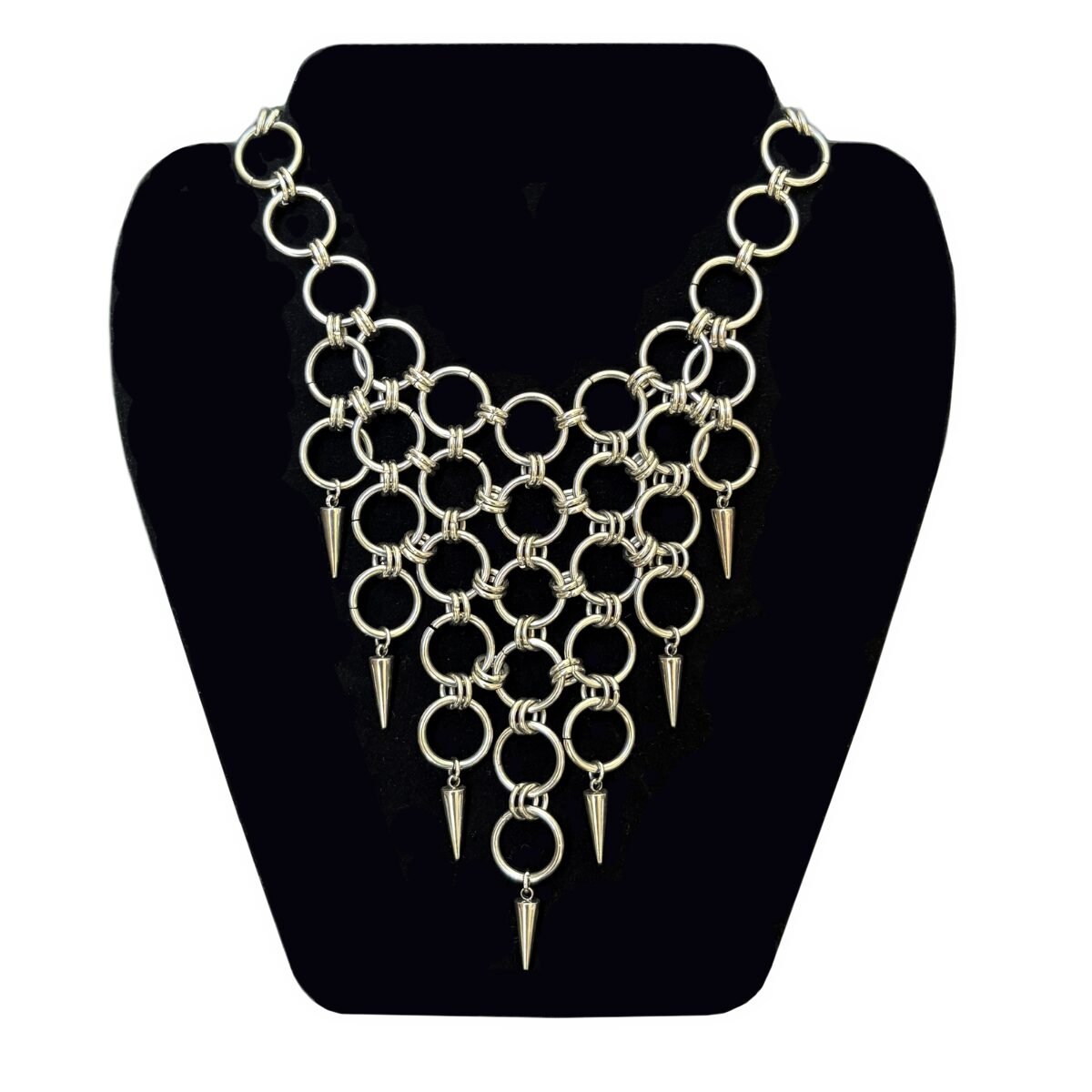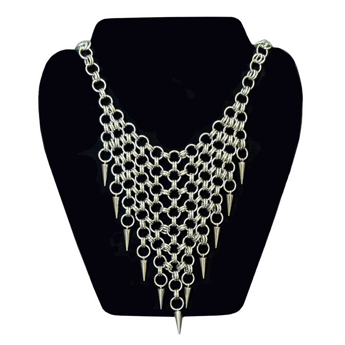 Materials: Non-tarnish 304 stainless steel jump rings, nickel-free alloy clasp, stainless steel spikes.