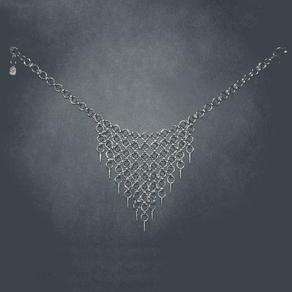 The Demigods necklace is a one-of-a-kind accessory that features a cascading triangular pattern that fans out gracefully from the collar and drapes over the chest. Each row is meticulously linked in the Japanese 4 in 1 weave to create a fluid yet geometric effect.