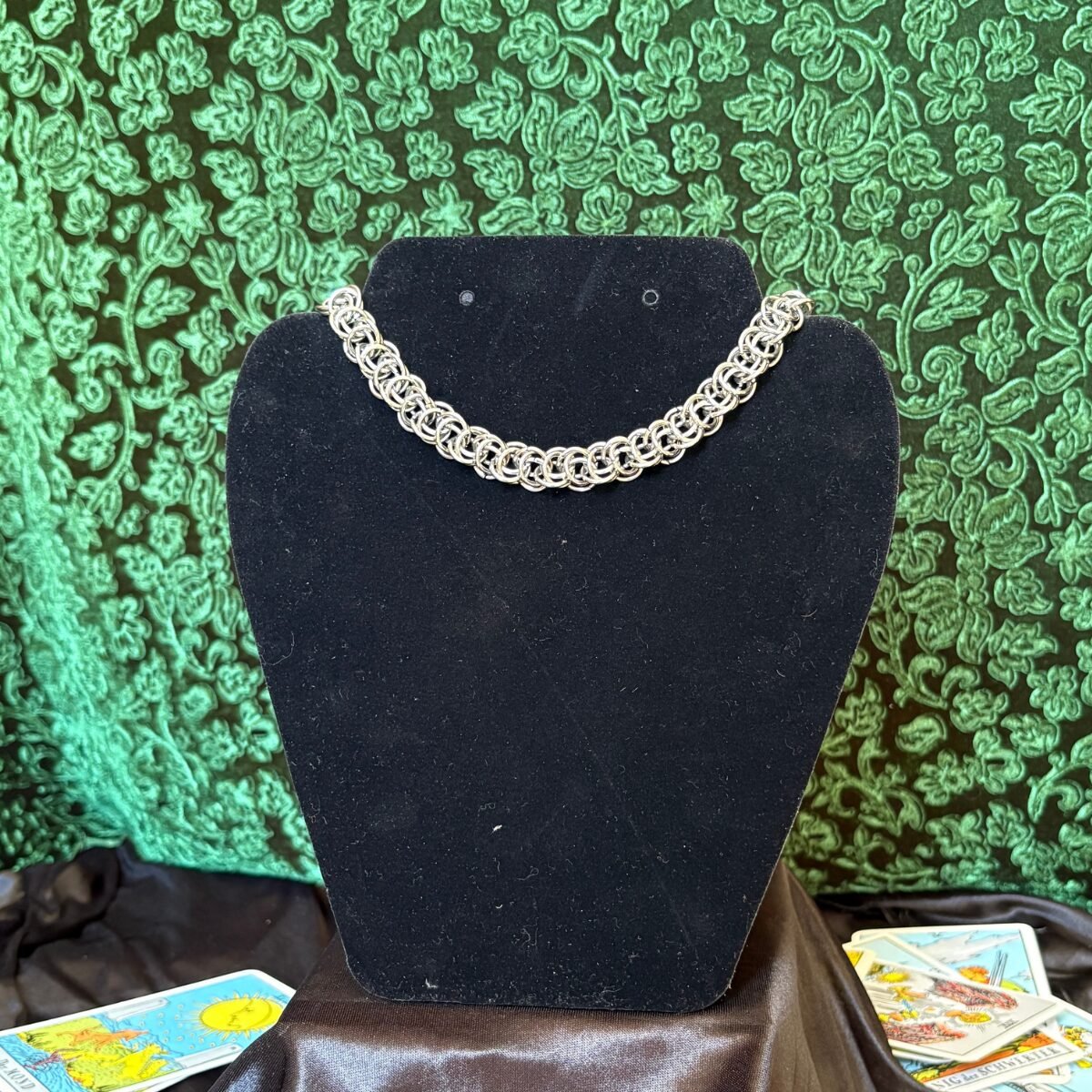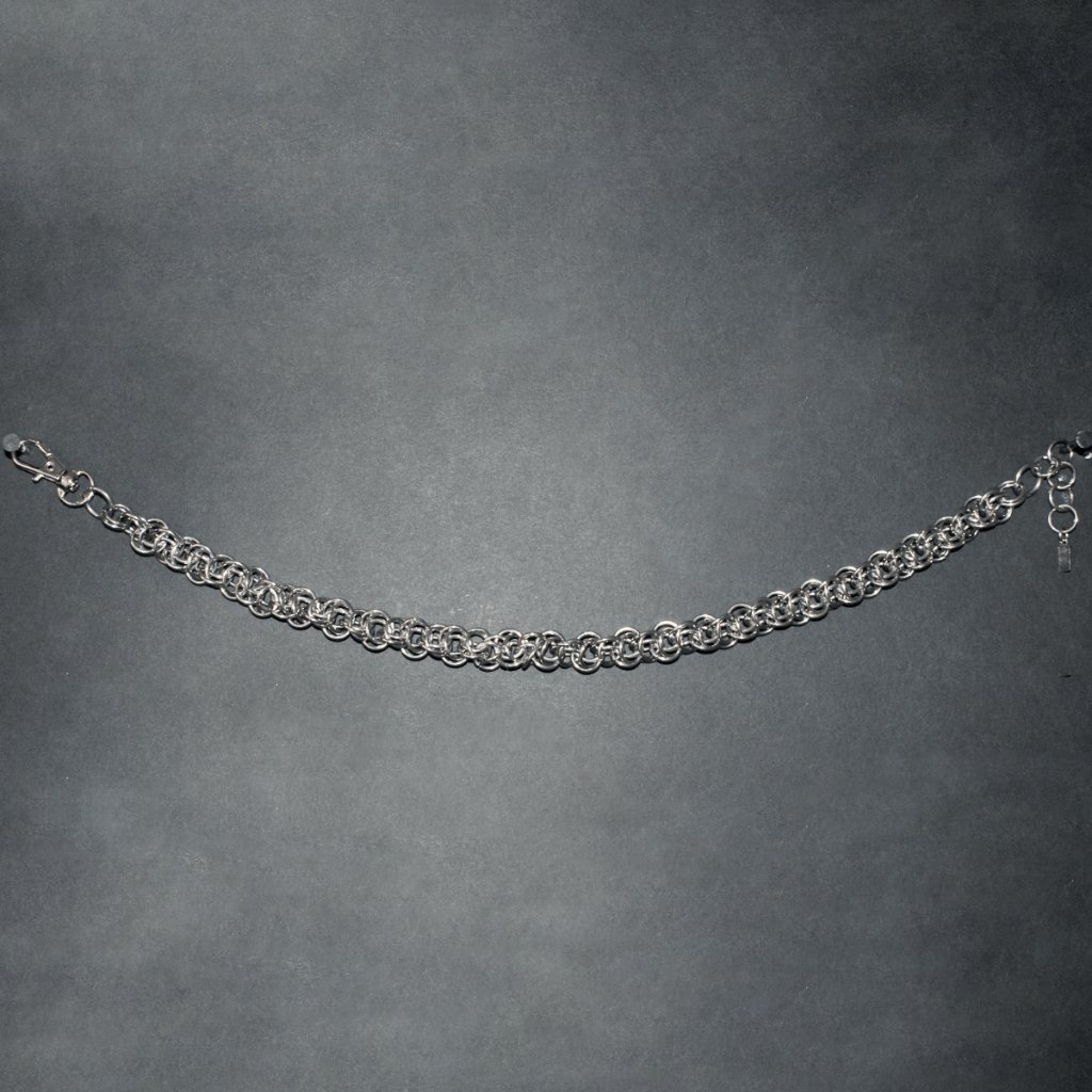 This necklace is a stunning example of classic chainmaille artistry, meticulously made in the Backbone pattern, that provides a three-dimensional texture and interesting pattern. The rings create a tough, durable yet flexible design that is both comfortable to wear and visually striking.