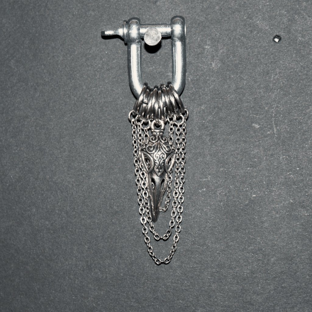 From there, two distinctive dangles extend downward, each telling its own story. One features a long, sleek silver chain that exudes contemporary elegance, while the other boasts a crow skull charm adorned with detailed engravings and filigree patterns—a nod to our goth roots.