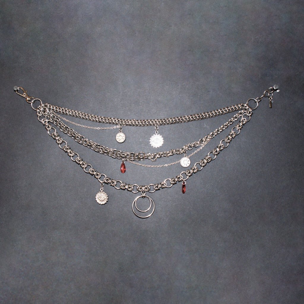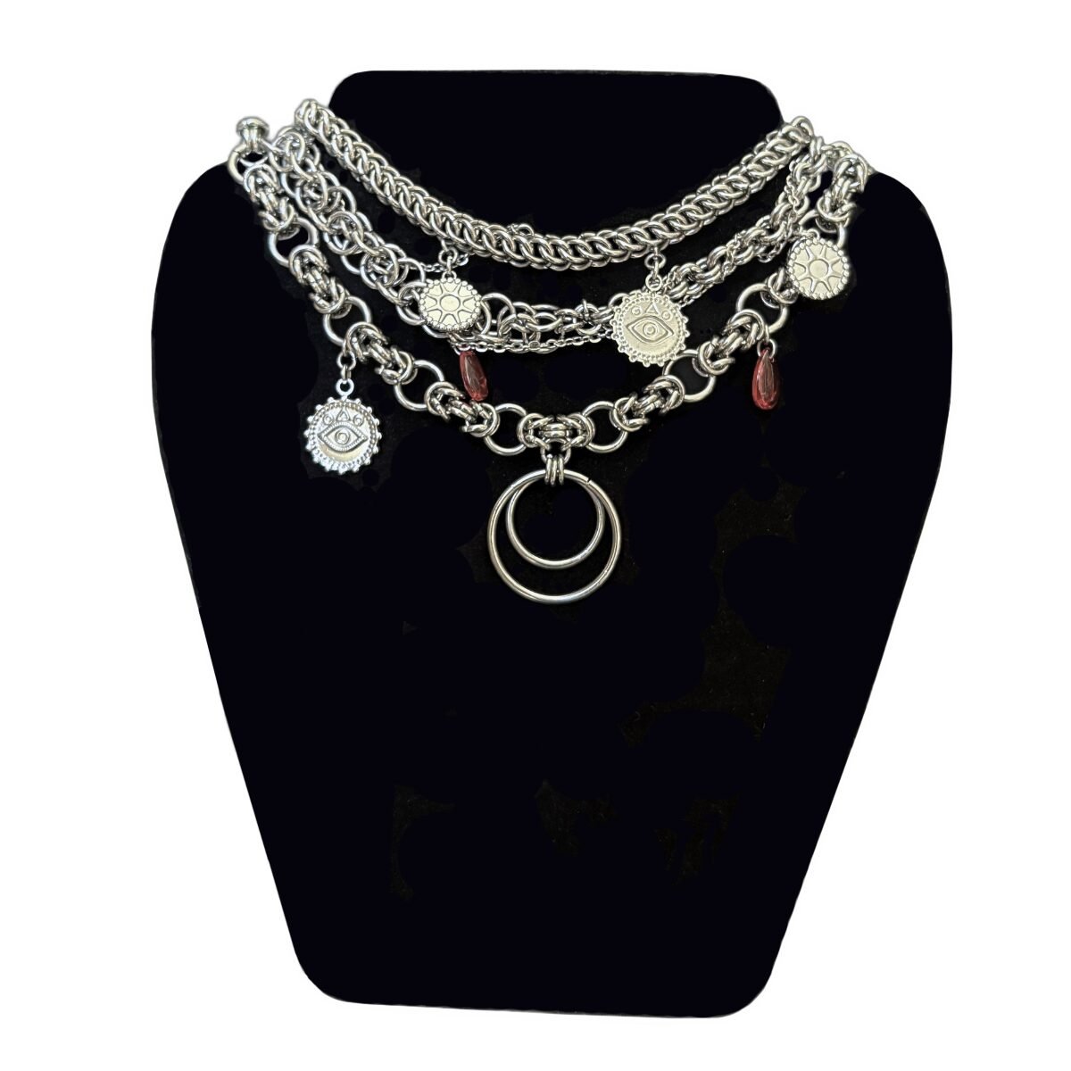 The necklace’s distinctive details make it impossible to miss. Thin chain is chaotically wrapped around sections of chain, stainless steel discs shimmer with understated elegance, red glass teardrops bring a touch of warmth, and the central moon-shaped pendant serves as a striking focal point. No two sections of the necklace are alike, yet together they form a cohesive masterpiece that celebrates individuality.