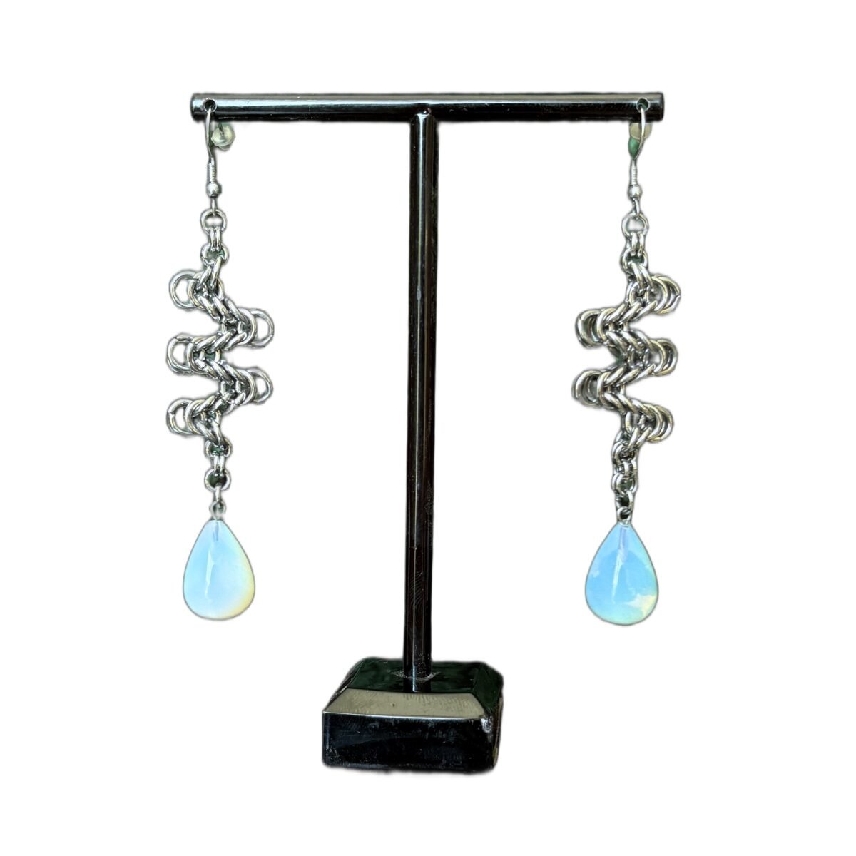 Adding a distinct touch to this edgy metallic framework is a single iridescent opal bead reminiscent of a teardrop suspended delicately at the bottom. The translucent opal teardrop radiates a soft, glowing sheen, offering a dreamy contrast to the silver metalwork above.