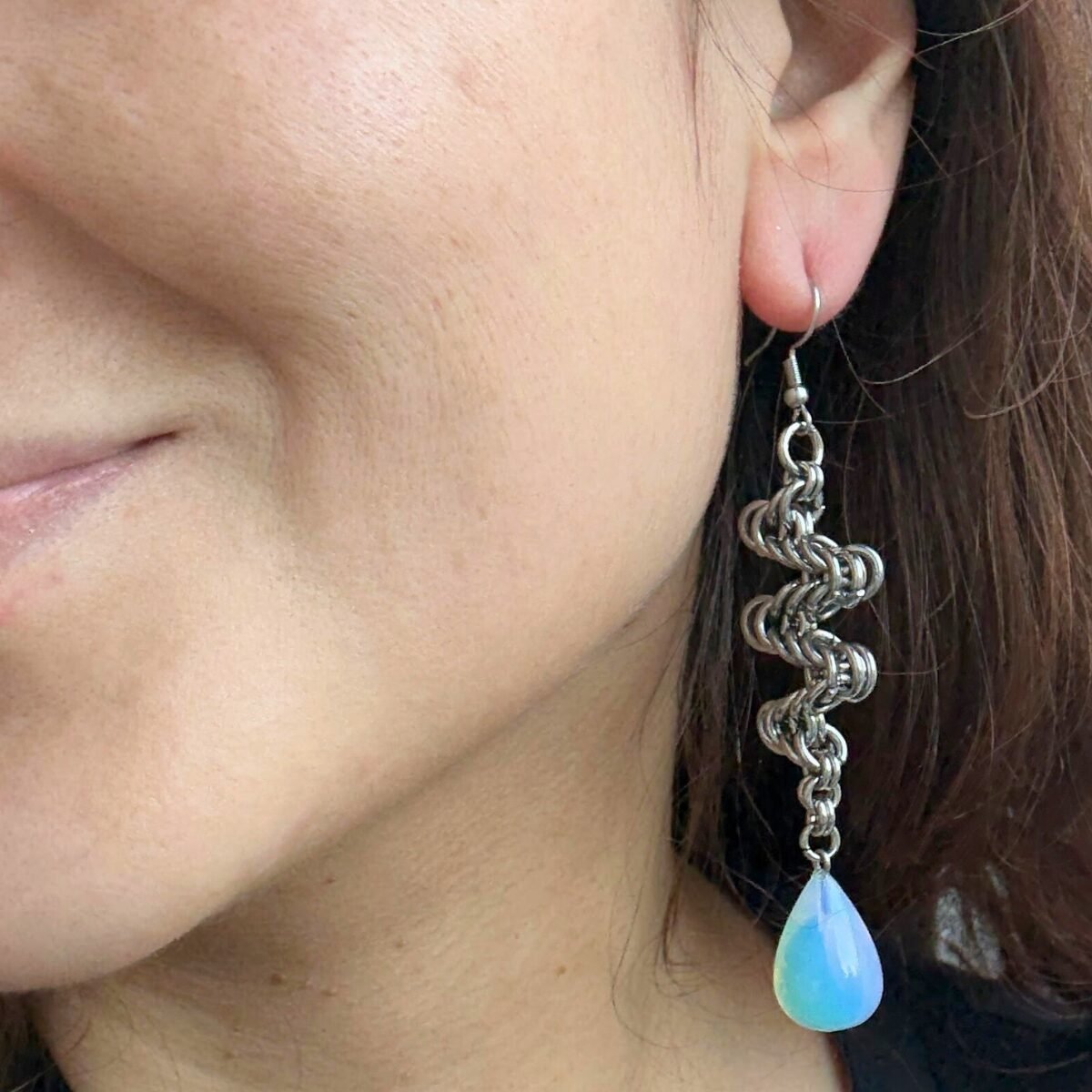 Handmade in our workshop in Berlin, the Fluss chainmaille earrings are ideal for anyone seeking a unique accessory. These earrings strike the perfect harmony between edgy and refined, with their bold metal structure and subtle opal accent. Their structure is meant to evoke the natural flow of water, culminating in one heavy drop of nature’s most precious element.
