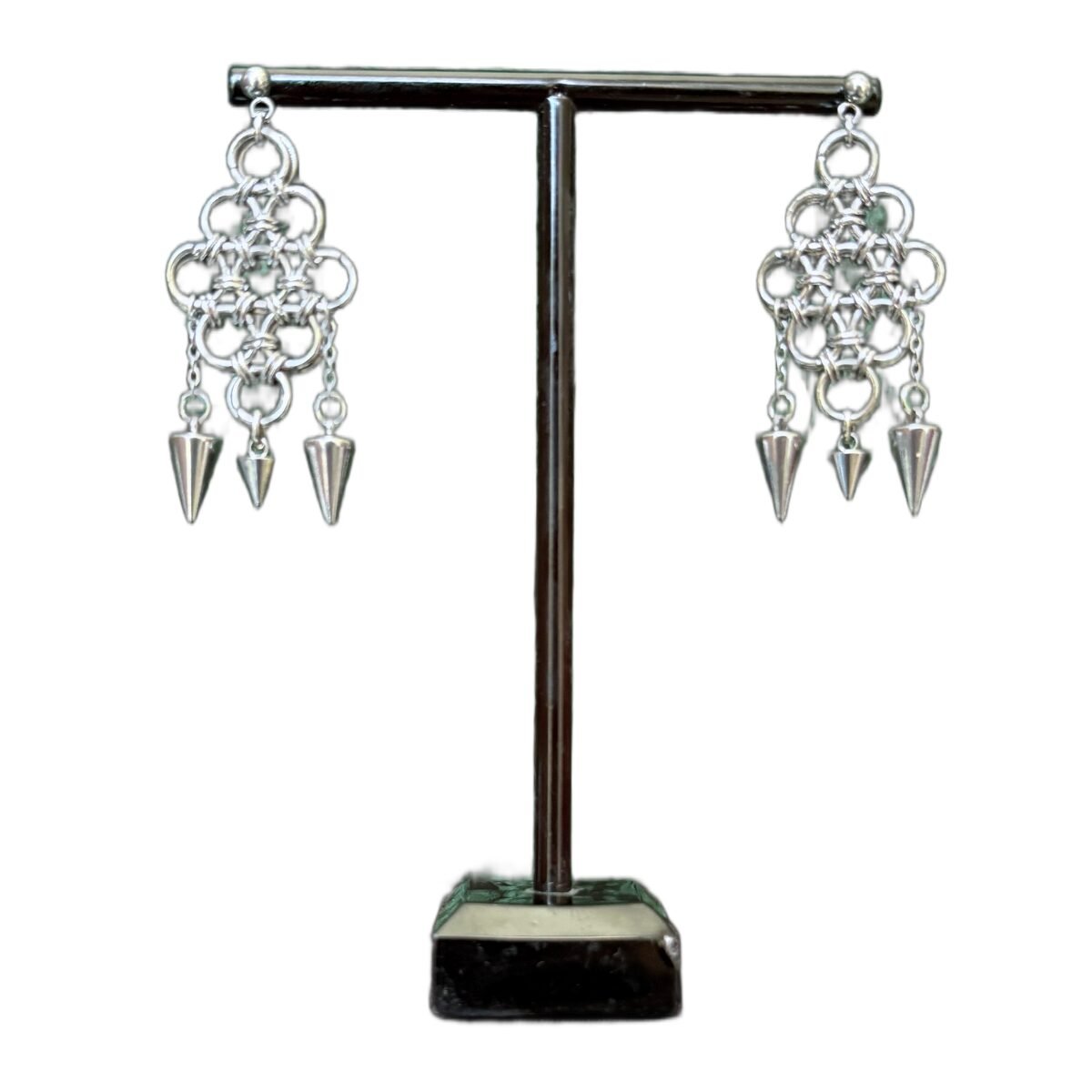 Materials: Non-tarnish 304 stainless steel jump rings, stainless steel hooks (with rubber backs), spikes and thin chain.