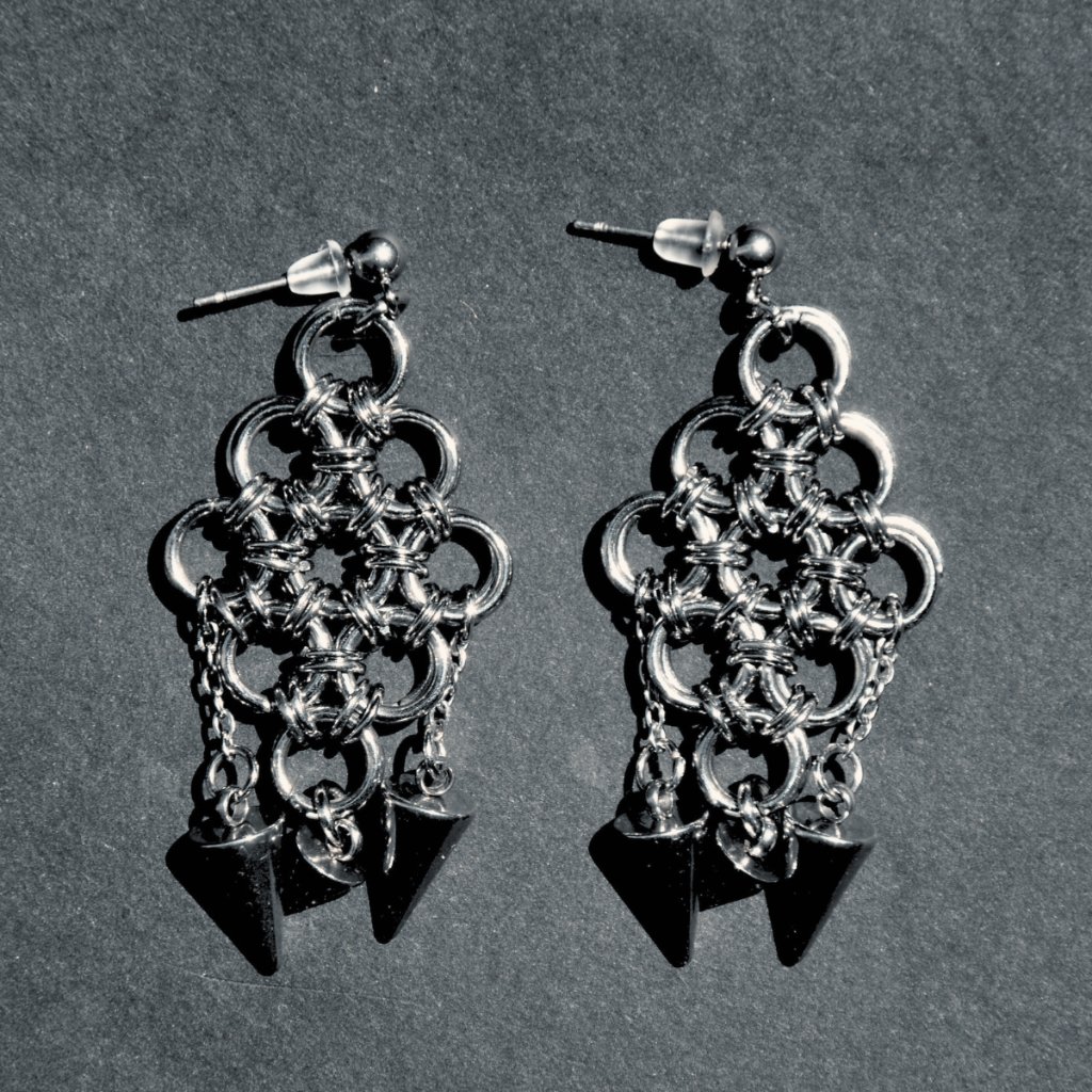 The Graupel chainmaille earrings feature a meticulously structured chainmaille design in the Japanese 12 in 1 weave. The pattern forms a tight, geometric lattice—almost floral in shape—creating a bold yet balanced silhouette. This modern aesthetic effortlessly harmonizes with various outfits and occasions.