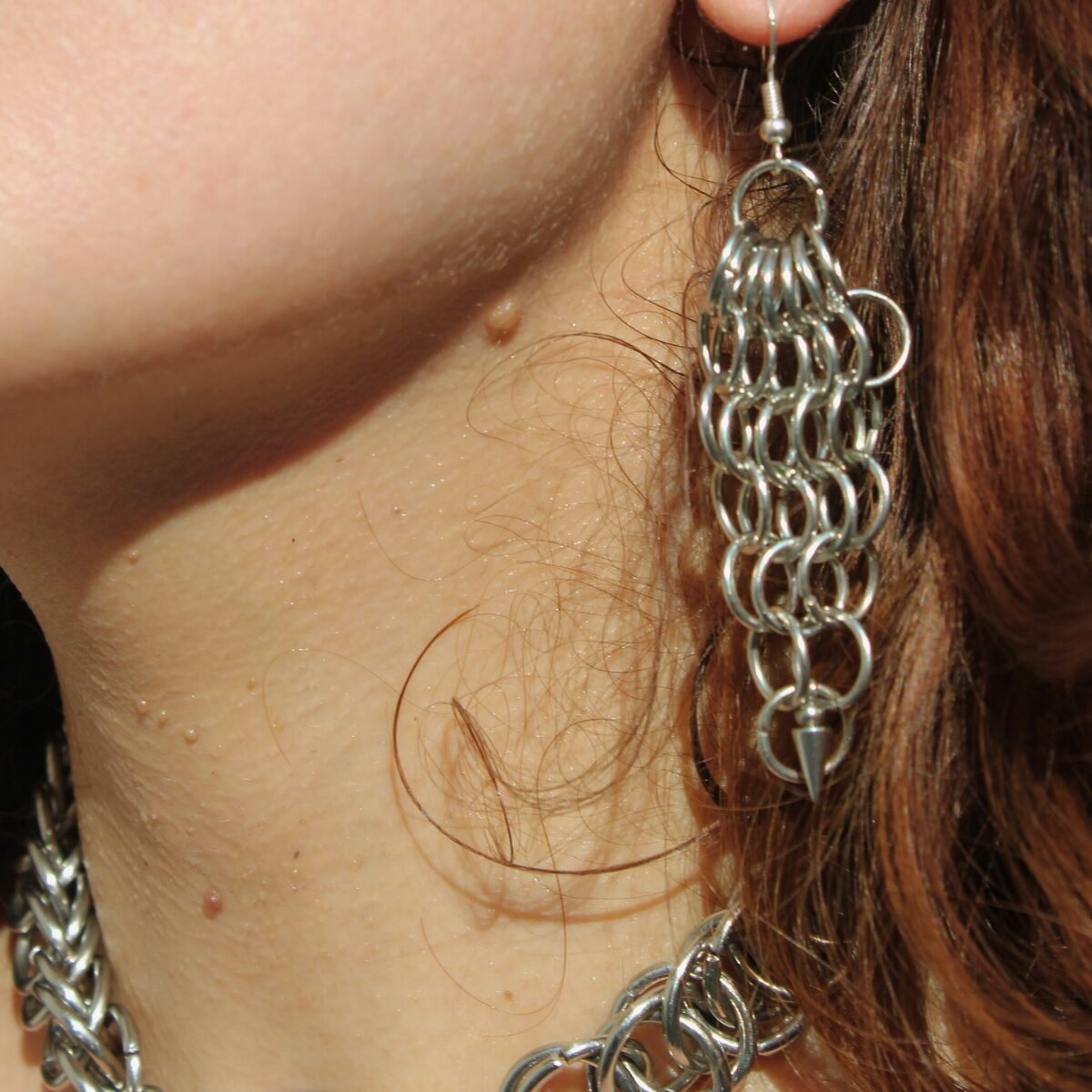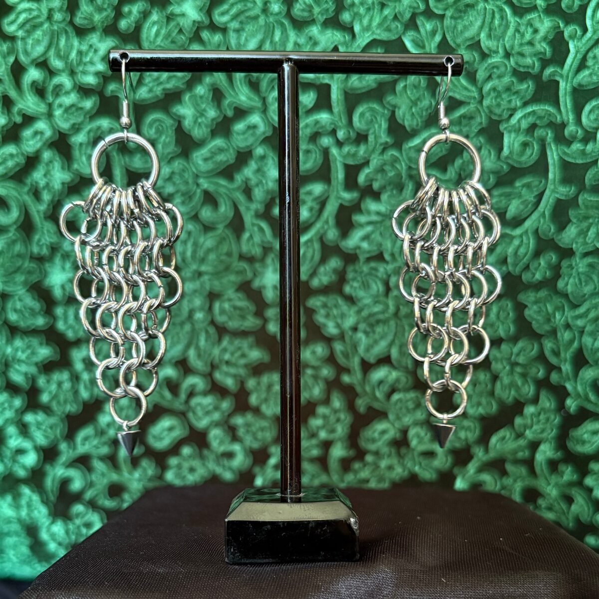 The Inamorata chainmaille earrings are elegant and classy, featuring a cascading panel of tightly woven rings in the timeless European 4-in-1 chainmaille pattern. The intricate design forms a sleek triangular drape, allowing the earrings to flow vertically from the ear with a sense of movement and refinement.