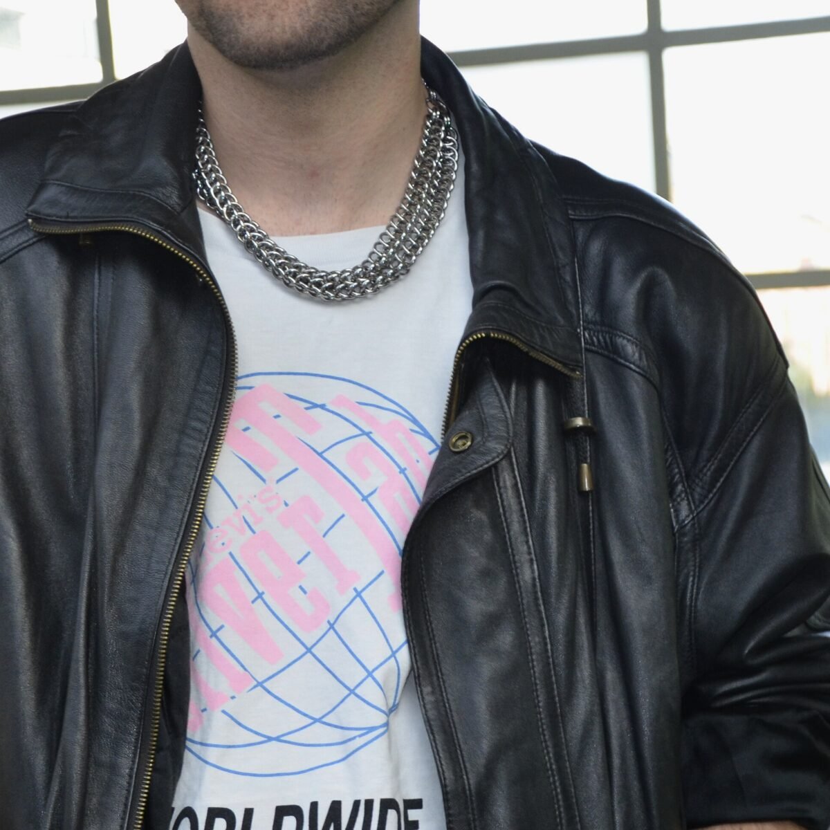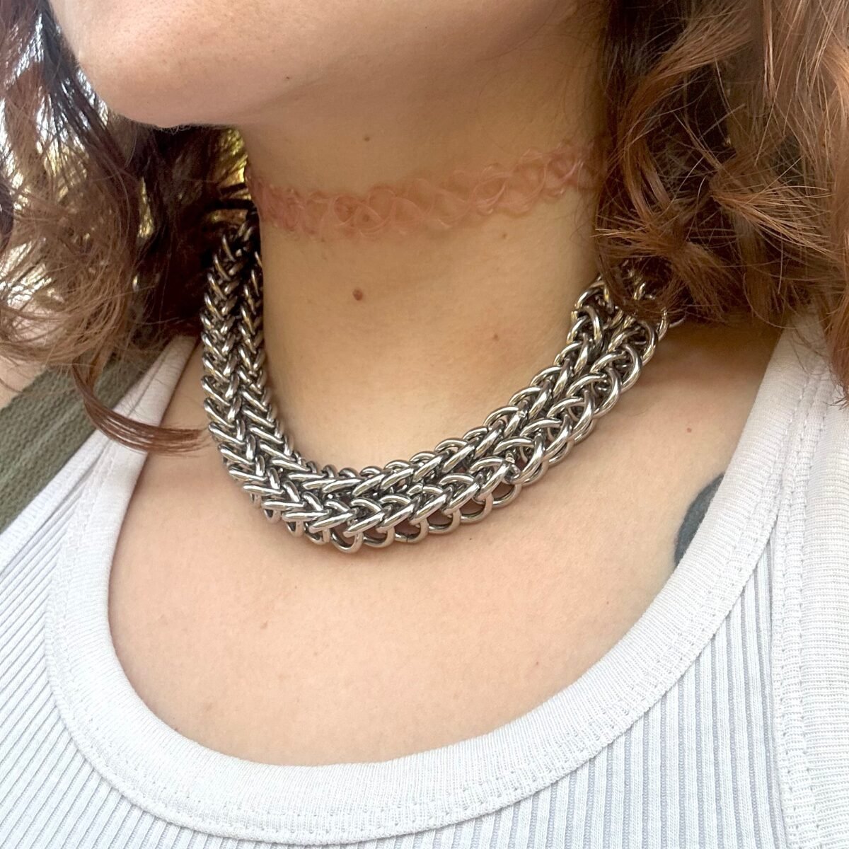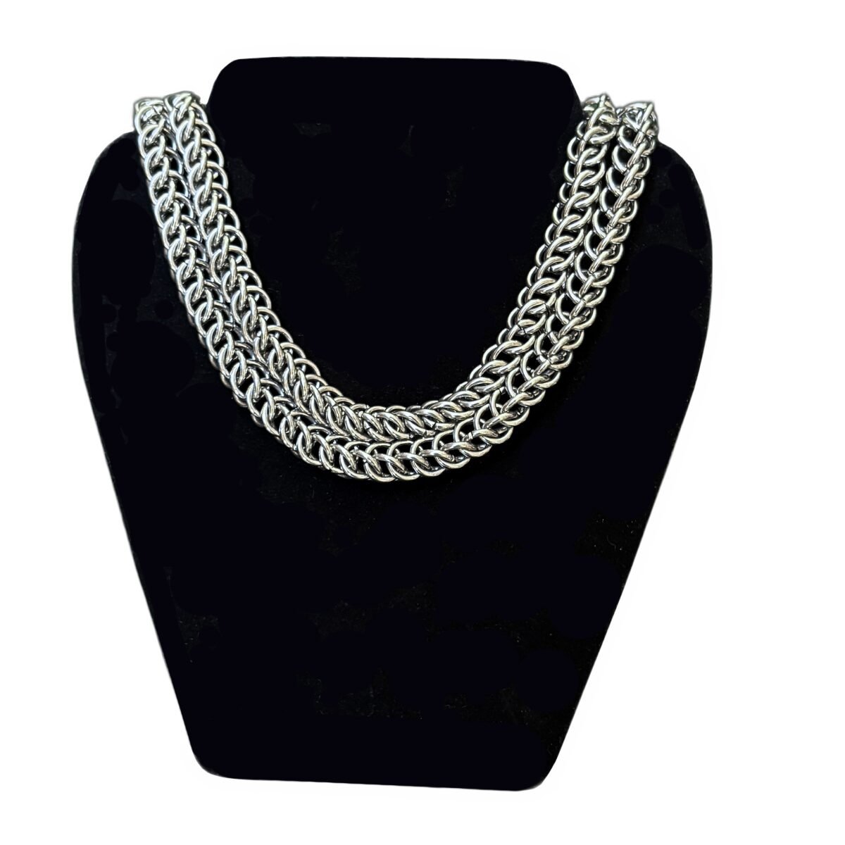 The Marigold chainmaille necklace is a chunky stainless steel piece that redefines powerful accessorizing. Made from two Half Persian 3 in 1 chains stacked together, its thick weaving creates a striking rope-like texture that sits firmly around the neck like a collar. The intricate work ensures a heavy, structured feel that won’t break.