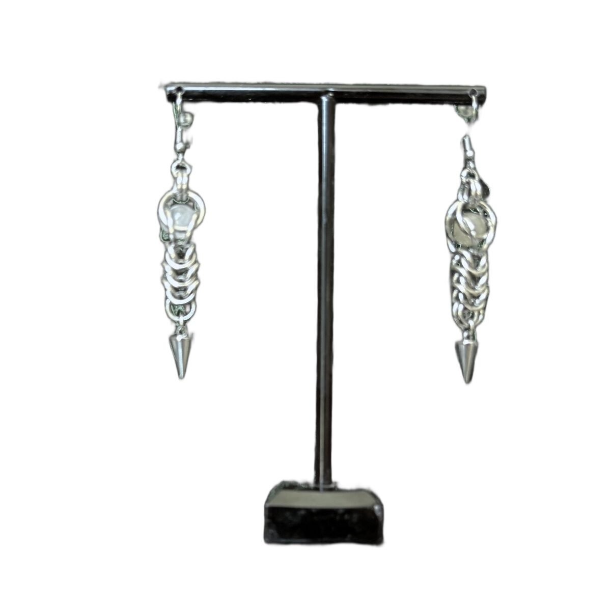 Materials: Non-tarnish 304 stainless steel jump rings, stainless steel hooks (with rubber backs) and spikes, glass beads.
