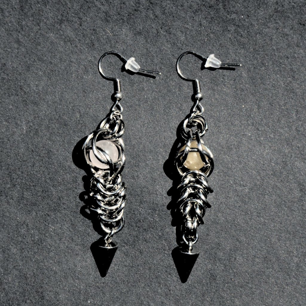 At the top of these stunning accessories is an encased pink glass stone, offering a pop of color that instantly catches the light. This delicate element contrasts beautifully with the daring silver spike charm that hangs from the bottom of each chain. The sharp, pointed spike adds a bold and rebellious finish, flawlessly complementing the metallic tones used throughout the design.
