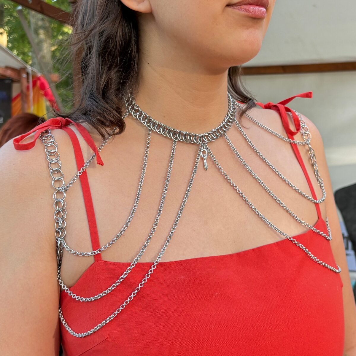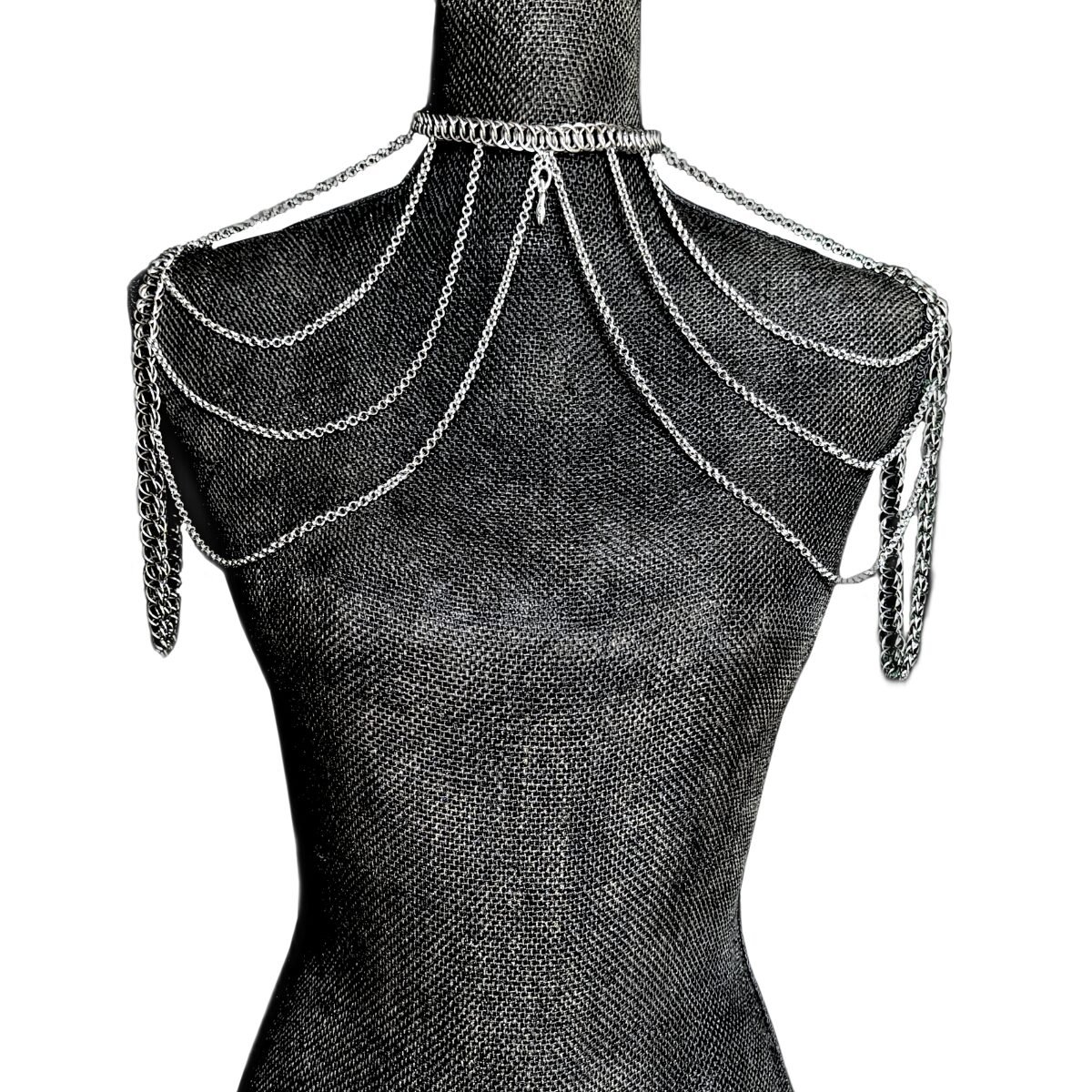 The silver metal body chain is a spectacular statement accessory designed to captivate and elevate your outfit. Featuring a thin Half-Persian 4 in 4 choker-style collar, this piece is constructed with simple 2-in-2 chains. It drapes elegantly over the shoulders, offering a unique and bold aesthetic that exudes confidence and sophistication. This regal addition is ideal for making an impression, accentuating a modern fashion-forward look.
