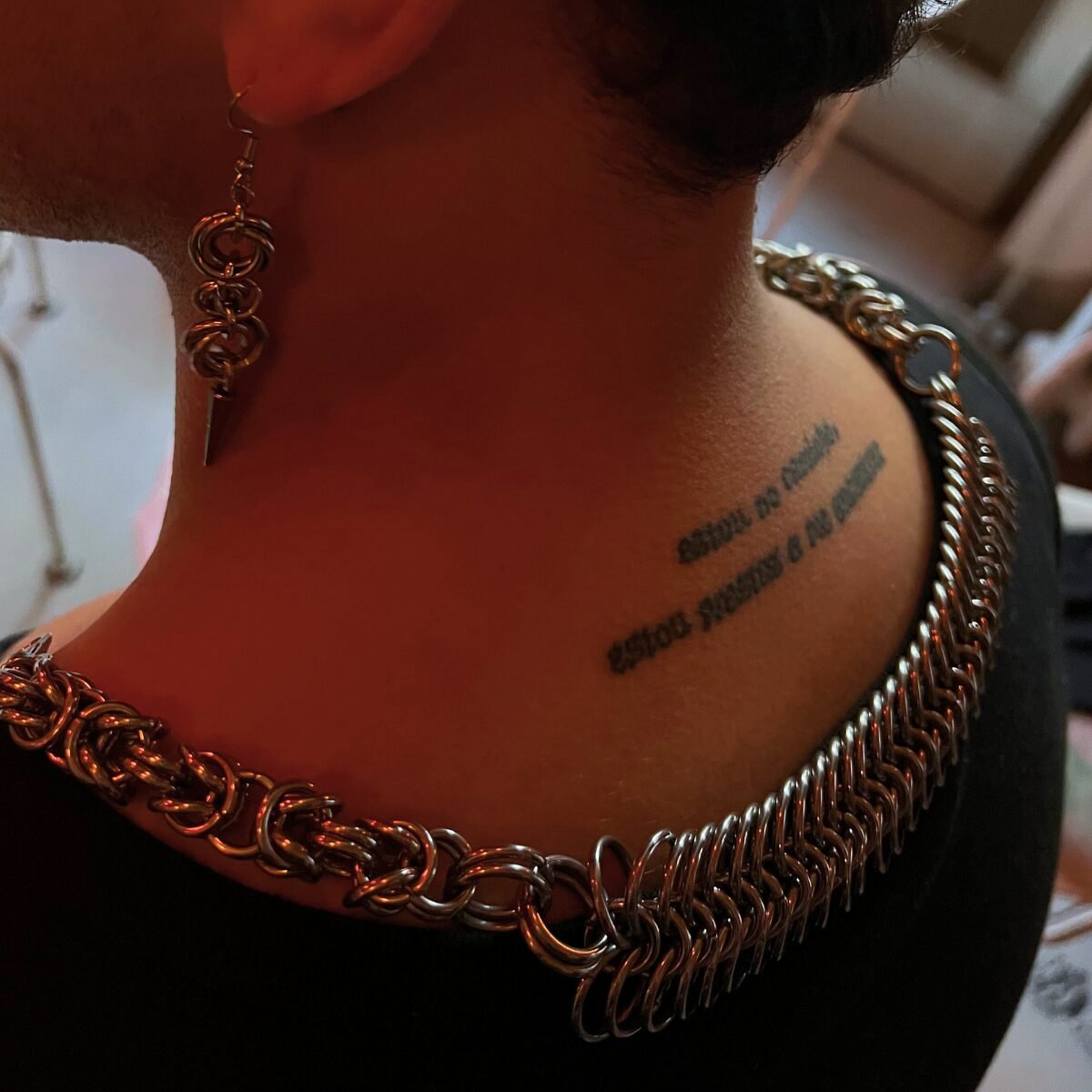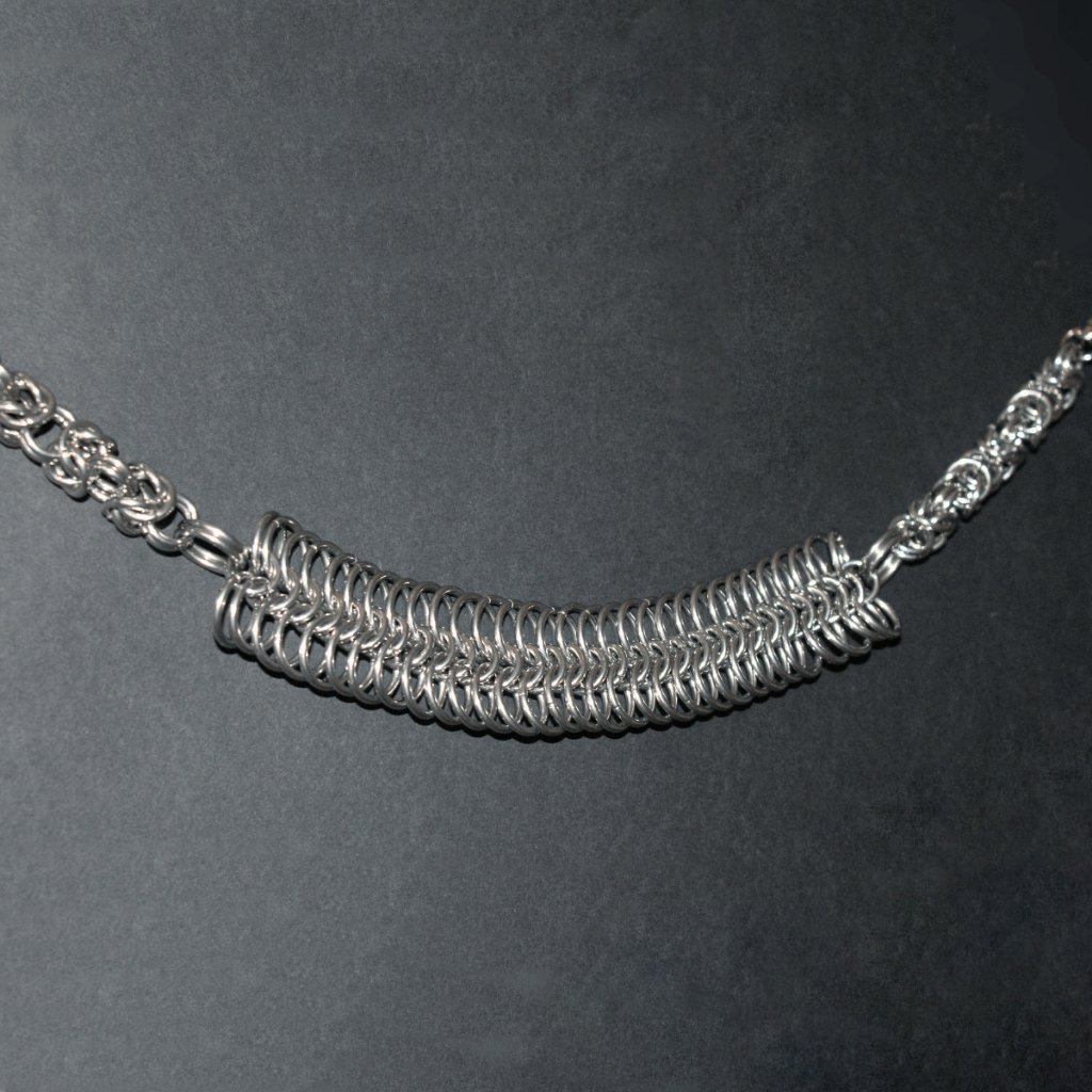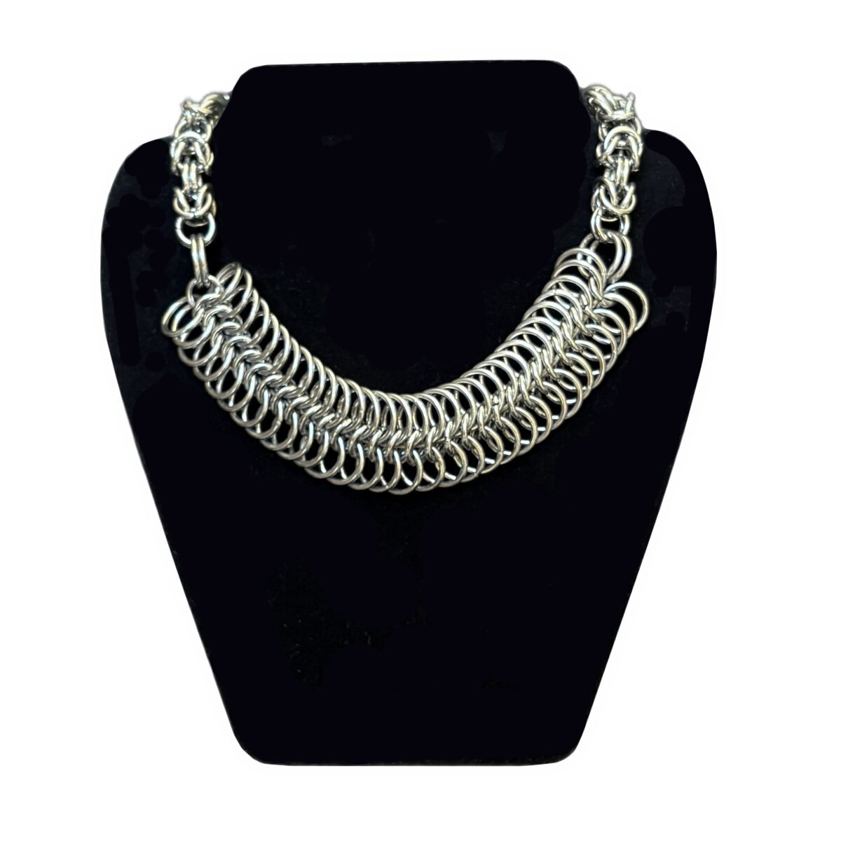 The Tension chainmaille necklace is big, heavy and full of attitude. Designed with the European 6 in 1 and Byzantine weaves, the combination of both patterns creates a dense, collar-like texture that’s both sturdy and stylish. This necklace simply exudes boldness and individuality.