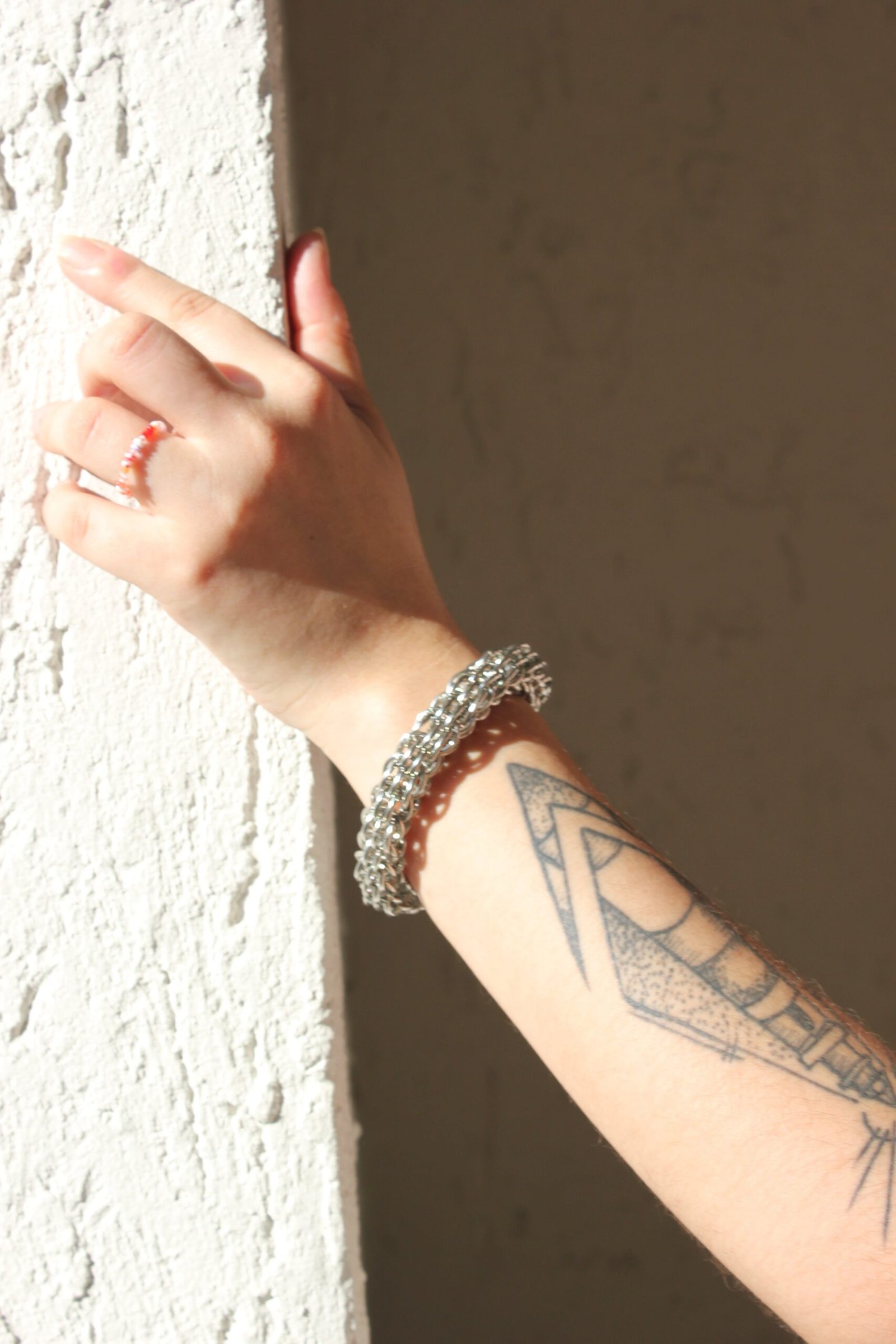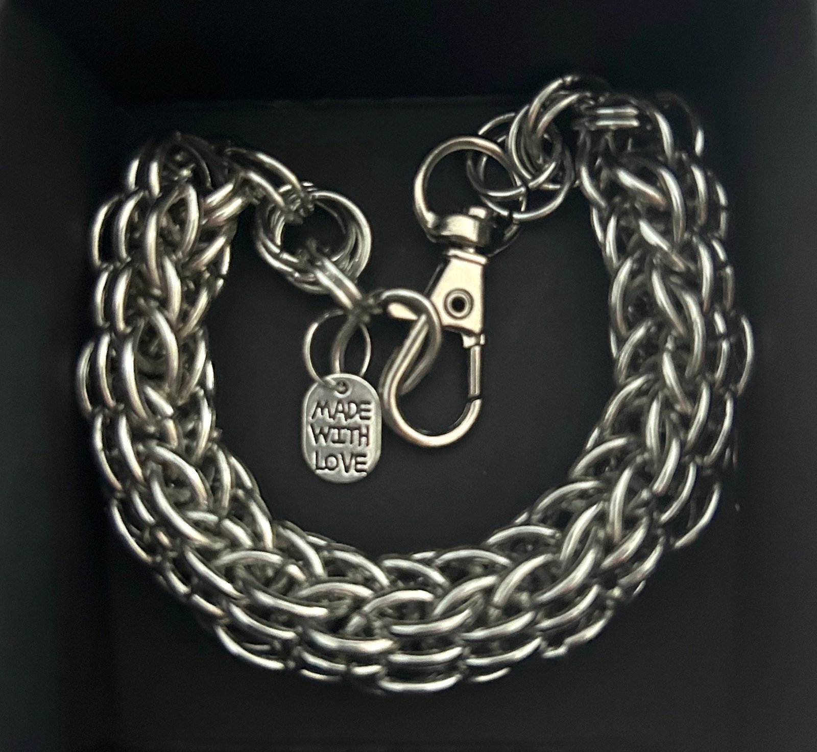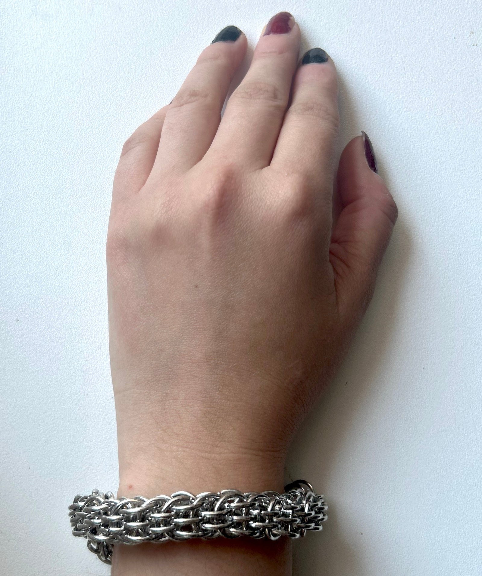 The Valor chainmaille bracelet is a thick, high-density chainmaille cuff bracelet. Its intricate Assyrian weave creates a broad, flexible band that hugs your wrist like soft, yet structured cuff.