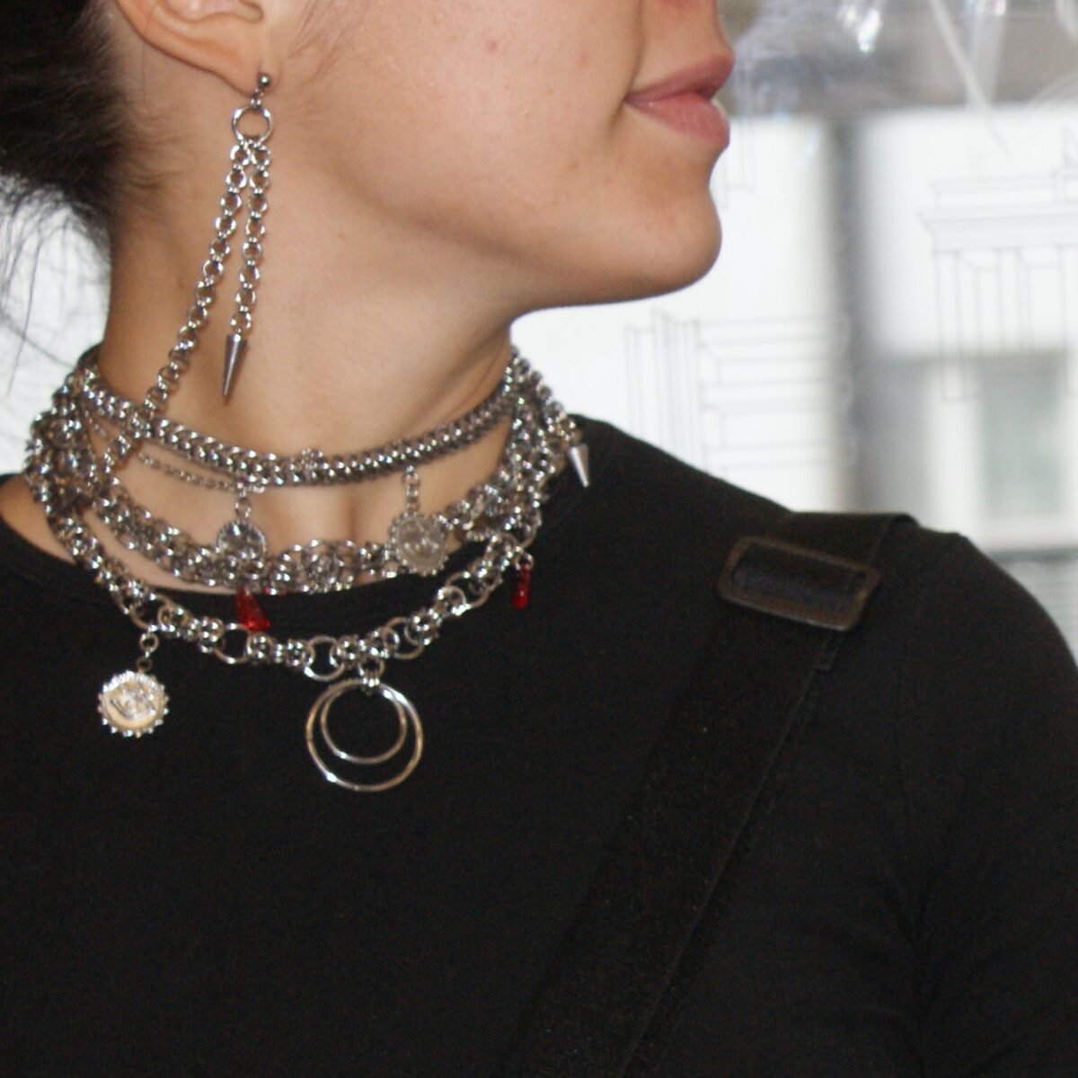 At the bottom of each chain sits a singular, pointed silver spike. This edgy addition provides contrast and intrigue, elevating the earring to a distinctive piece of artistry. Perfect for those who revel in unconventional fashion, this accessory ensures style and lightweight comfort.